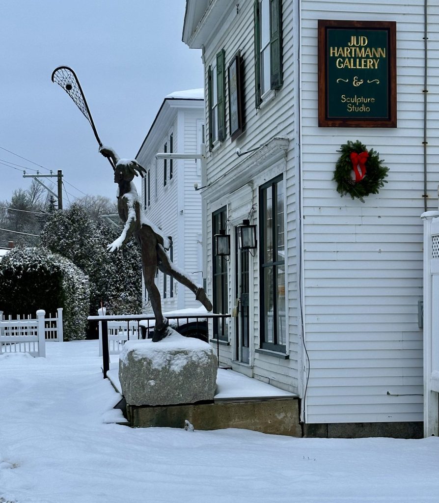 Accompanying each bronze is an acrylic plaque which gives the viewer historical insight into the sculpture. These plaques represent a small part of the exhaustive research into mostly primary sources from the early 16th c.- the early 19th c. by French, English, Dutch & American observers as well as the oral histories and traditions of the Native people and their contemporary descendants. The research is the foundation for all the sculptures. The bronze sculptures as well as a work in progress, along with a large display of paintings by talented local artists can be viewed in our Blue Hill, Maine gallery from mid-May into November. Learn more about our galleries on our Galleries page.